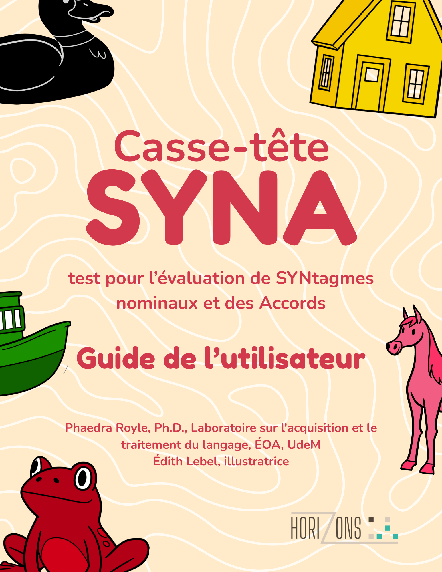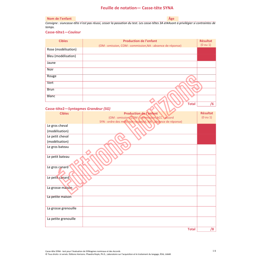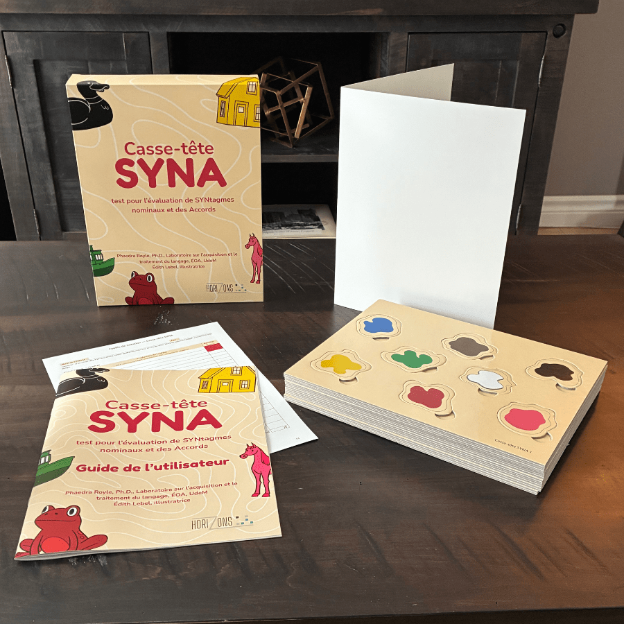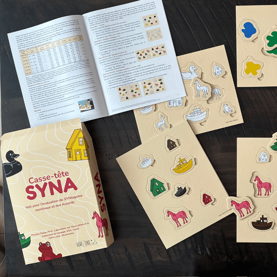 Le casse-tête SYNA (Évaluation des syntagmes nominaux et des accords) est un outil standardisé d’évaluation développé à l’Université de Montréal par Phaedra Royle, Ph.D., professeure titulaire et chercheure à l’École d’orthophonie et d’audiologie. Destiné aux orthophonistes, il permet d’évaluer le développement morphosyntaxique et le vocabulaire d’adjectifs chez les enfants franco-québécois de 3 à 8 ans.