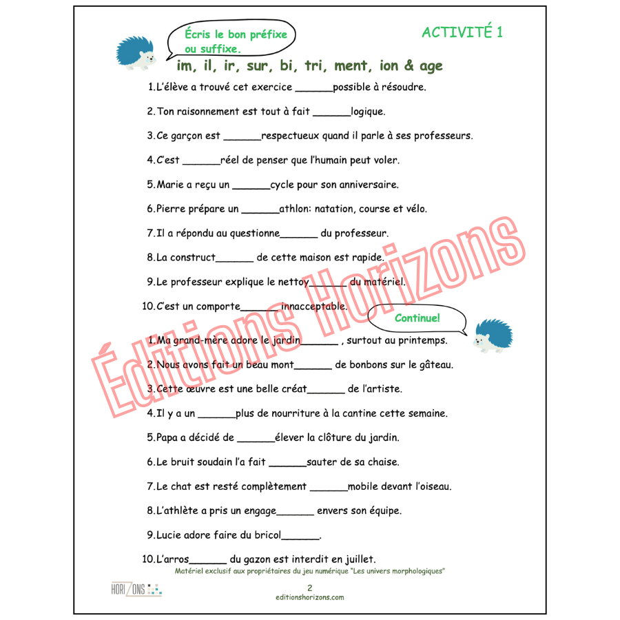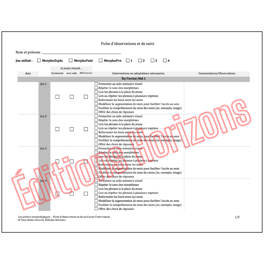 Accessible depuis un compte aux Éditions Horizons, la plateforme se manipule sur ordinateur, tablette ou TNI. Aucune donnée n’est enregistrée automatiquement, mais une fiche d’observation et de suivi est fournie pour consigner la progression des apprenants et les stratégies d’intervention utilisées. Les 9 cahiers d’activités complémentaires imprimables consolident les apprentissages orthographiques et prolongent le travail hors écran. Un guide détaillé accompagne le tout, présentant les stratégies d’enseignement, la gradation morphologique et des exemples d’activités préparatoires. Un corrigé des cahiers d’activités complémentaires est également fourni.