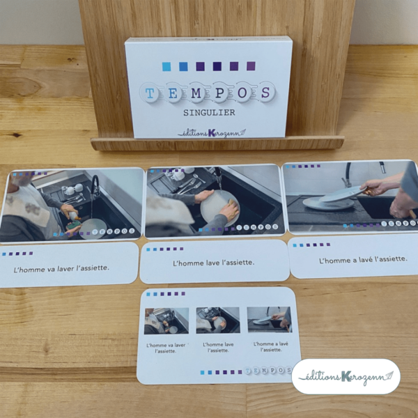 Tempos singulier est un support de langage qui permet d’aborder la séquentialité des actions (il va faire, il fait, il a fait). Cette boîte comprend dix séries de trois actions en photo à la troisième personne du singulier. Ce matériel peut s’utiliser en langage oral mais aussi en langage écrit (des cartes phrases sont proposées afin d’y associer chaque image). Une carte correction reprend la séquence dans l’ordre avec les textes proposés. Des cartes méthodologiques accompagnent ce support.