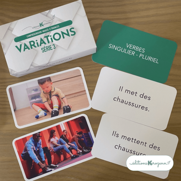 Variations série 3 propose un support de 86 cartes pour travailler sur la compréhension et l’expression d’énoncés calibrés et ciblés pour des enfants, adolescents et adultes. Au recto de la carte se trouve une photo et au verso l’énoncé est écrit. Chaque carte est présente en deux exemplaires. Ce support permet de travailler en appariement photo / photo, photo / énoncé ou encore énoncé / énoncé.